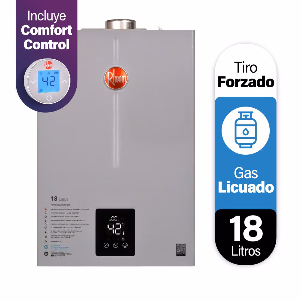 Descubre el nuevo Calefón Digital Rheem 18-21L Tiro Forzado: máxima eficiencia, tecnología de punta y comodidad total. Compatible con el control Comfort Control (se vende por separado), te permite ajustar la temperatura del agua desde cualquier habitación sin cables ni conexión WiFi, con un alcance de hasta 30 metros. Cuenta con panel digital, sistema modulante que ahorra hasta un 30% de energía, serpentín 100% de cobre, múltiples sistemas de seguridad, y es ideal para uso simultáneo en varias salidas de agua. ¡Agua caliente al instante, con la confiabilidad de una marca con más de 100 años de innovación!