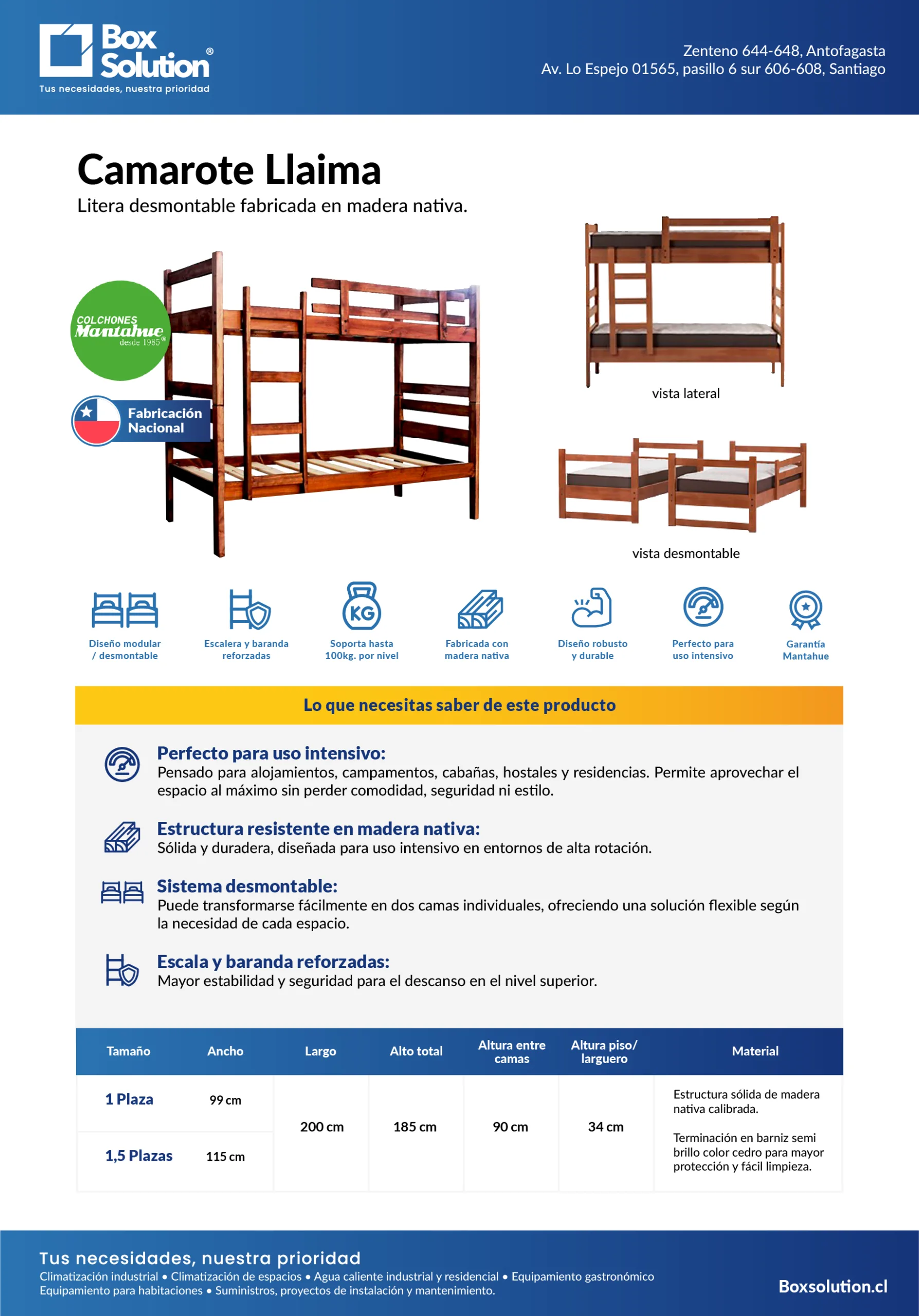 Pensado para alojamientos, campamentos, cabañas, hostales y residencias. Permite aprovechar el espacio al máximo sin perder comodidad, seguridad ni estilo.